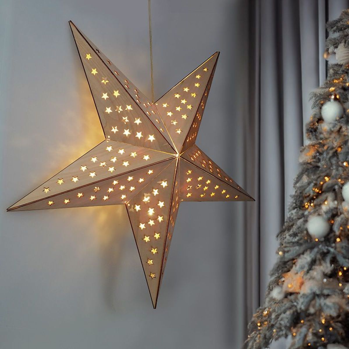 Solight LED dřevěná vánoční hvězda, závěsná, časovač, 20x LED, 65cm, 2x AA