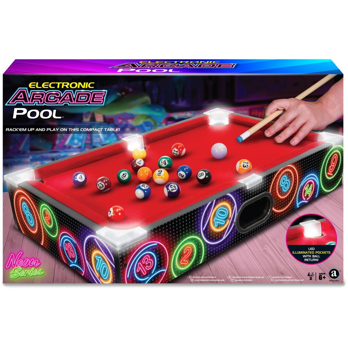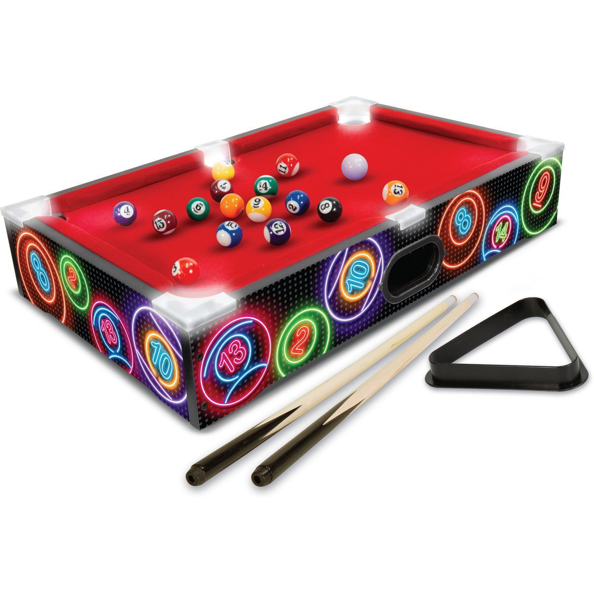 Stolní kulečník o délce 51 cm (20") vnese do vašeho domova nebo kanceláře klasickou hru pool v kompaktní a interaktivní podobě. Díky malým rozměrům se snadno umístí kamkoliv a zabaví hráče všech věkových kategorií. ·Osvětlené rohové kapsy – barevné LED světlo zvýrazní každý vstřelený bod a umocní atmosféru hry. ·Automatický návrat koulí – systém se postará o plynulou hru bez nutnosti sbírat koule ručně. ·Profesionální kulečníkové koule – vyrobené z odolného materiálu, přesně jako na plnohodnotném stole, pro autentický zážitek. Obsah balení: ·1× dřevěný kulečníkový stůl ·16× kulečníkové koule ·2× tága ·1× trojúhelníkový rám ·Návod k obsluze