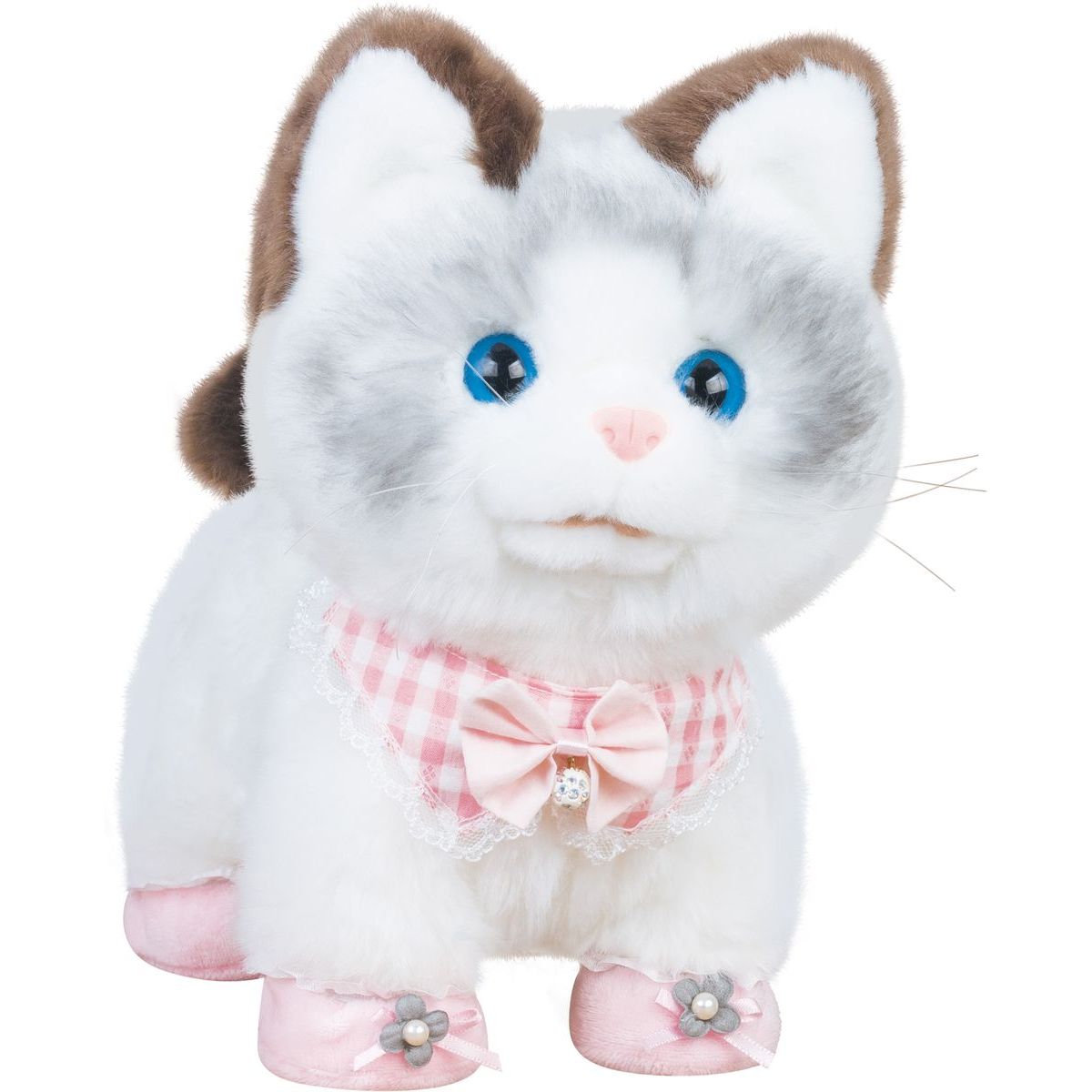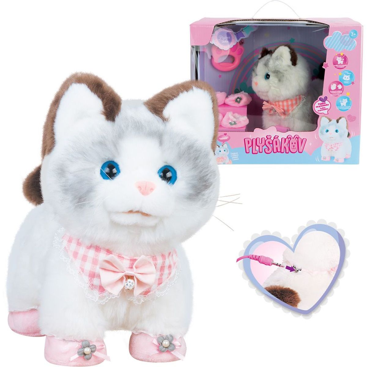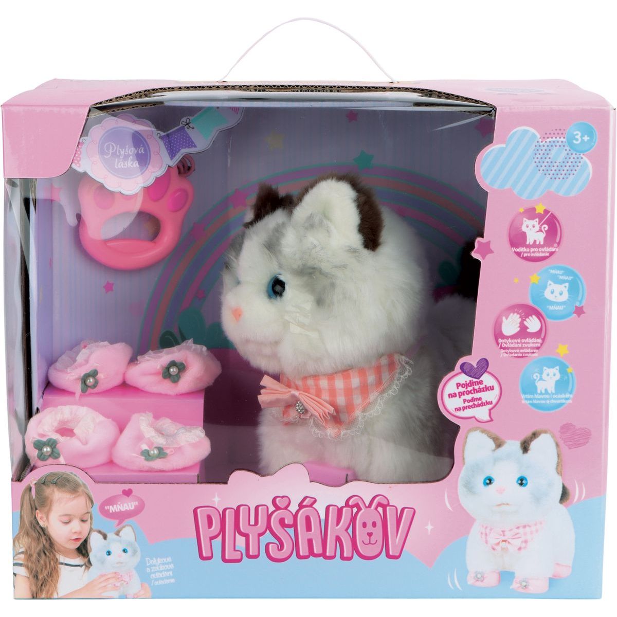 Hledáte hračku, která oživí dětské chvíle plné radosti a zábavy? Interaktivní Kočička Mína je plyšový společník, který chodí, mňouká a vrtí ocáskem na povel stiskem tlačítek umístěných na hlavě, krku a ocásku. Díky jednoduchému ovládání přes spínač ON/OFF si děti užijí nekonečné hodiny mazlení i hraní. Její měkký plyšový materiál láká k pohlazení a společným dobrodružstvím, které přinášejí její zvuky a pohyby. Kočička Mína je ideálním dárkem pro děti od tří let, kteří chtějí mít svého vlastního interaktivního kamaráda. Pro provoz jsou potřeba 3 baterie AA (1,5 V), které nejsou součástí balení. Rozměry balení jsou 34 x 28,5 x 22 cm a váha činí 1,25 kg – perfektní velikost pro malé ruce i velké objetí.