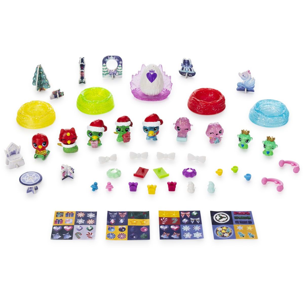 Obsah kalendáře: 9 figurek Hatchimals, příslušenství, samolepky, papírové doplňky, 5 hnízd.