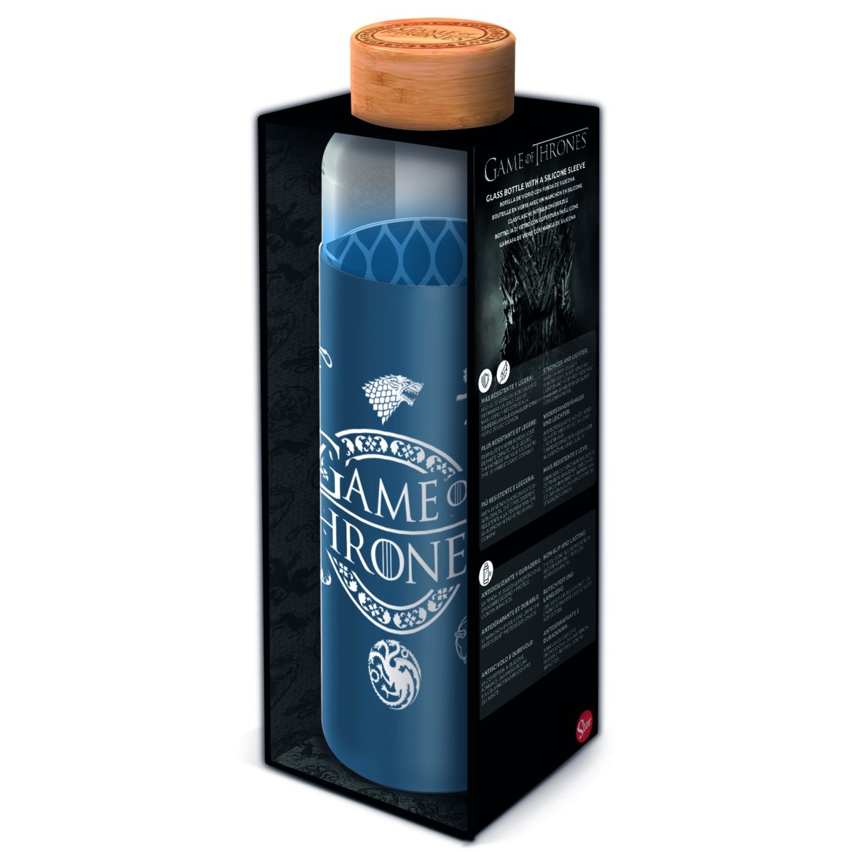 Vstupte do světa Hry o trůny s touto elegantní skleněnou láhví o objemu 585 ml, která je vybavena silikonovým návlekem zdobeným motivy vašich oblíbených hrdinů. Tato láhev není jen stylovým doplňkem, ale také praktickým pomocníkem, který vám pomůže udržet správný pitný režim během dne. Díky dostatečné kapacitě se hodí pro každodenní použití doma i na cestách. Navíc je dodávána v dárkovém boxu, což z ní činí ideální dárek pro fanoušky seriálu i milovníky kvalitních doplňků. Užijte si spojení funkčnosti a designu inspirovaného jedním z největších televizních fenoménů.