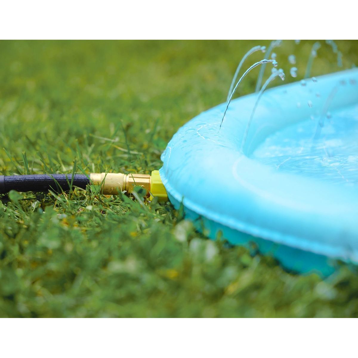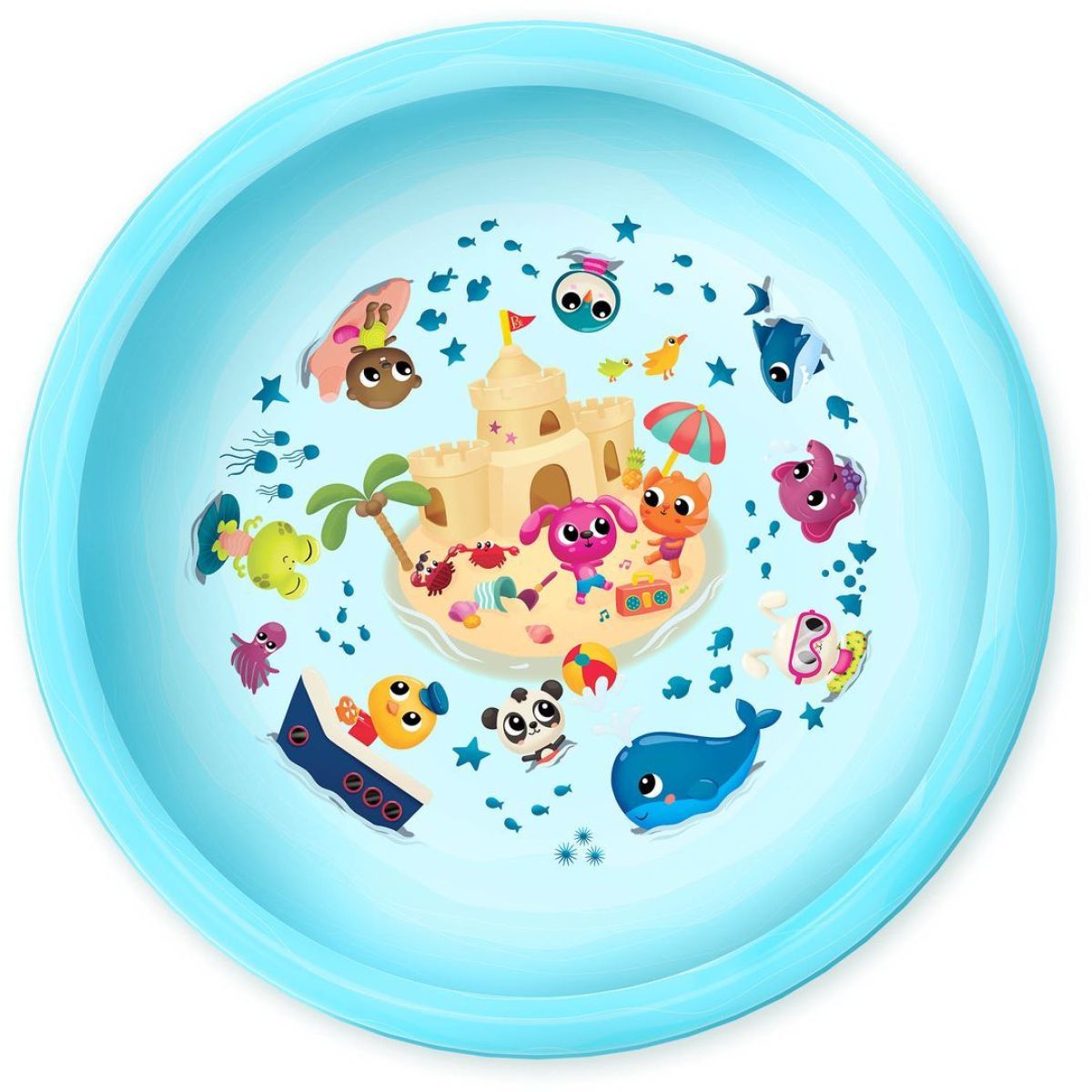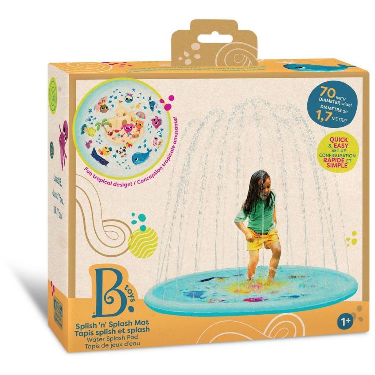 Objevte svět zábavy s tropickou stříkací hrací podložkou Splish 'n' Splash od B. Toys. Tato velká vodní podložka nabízí osvěžující vodní spršky až do výšky 120 cm, které potěší děti od 12 měsíců výše. S průměrem cca 178 cm poskytuje dostatek prostoru pro více dětí, aby si mohly společně užít letní radovánky. Jednoduché připojení na zahradní hadici (5/8") zajišťuje snadnou přípravu k použití. Po hře stačí podložku vypustit a nechat uschnout. Tento produkt podporuje pohyb, koordinaci a smyslový rozvoj dětí, a nevyžaduje žádné baterie.