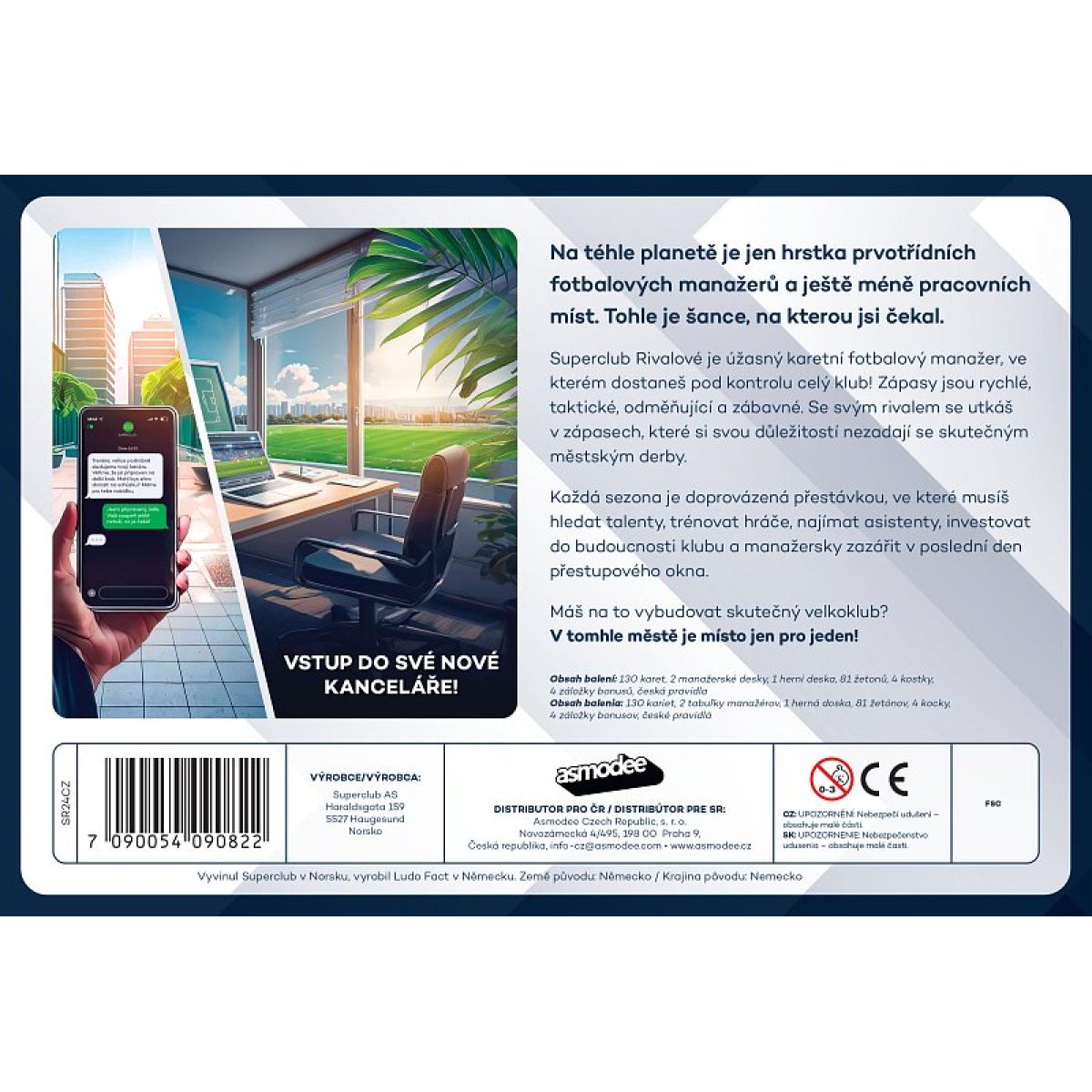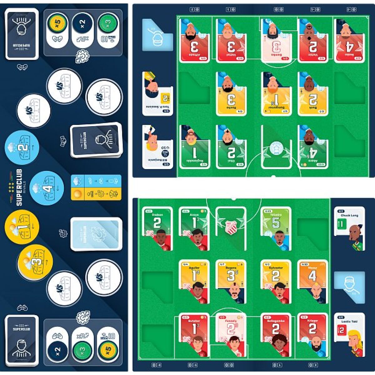 Superclub Rivalové je strategická karetní hra pro dva hráče, která simuluje komplexní práci fotbalového manažera. Hráči budují vlastní klub, posilují kádr, investují do klíčových oblastí rozvoje a využívají taktické možnosti k dosažení maximální výkonnosti týmu. Každá sezona kombinuje přestupové období, trénink, hledání talentů i rozhodující zápasy, v nichž hrají roli strategie, pravděpodobnost i správné načasování akcí. Díky rychlému tempu, vysoké znovuhratelnosti a věrné atmosféře fotbalového prostředí jde o ideální volbu pro fanoušky sportovních simulací.