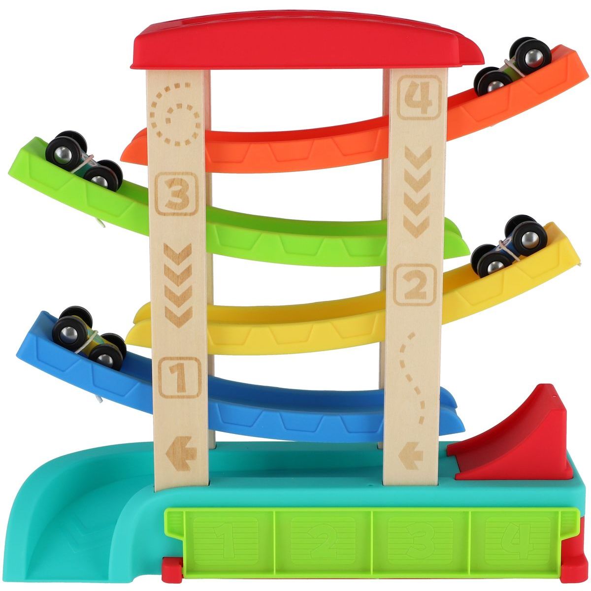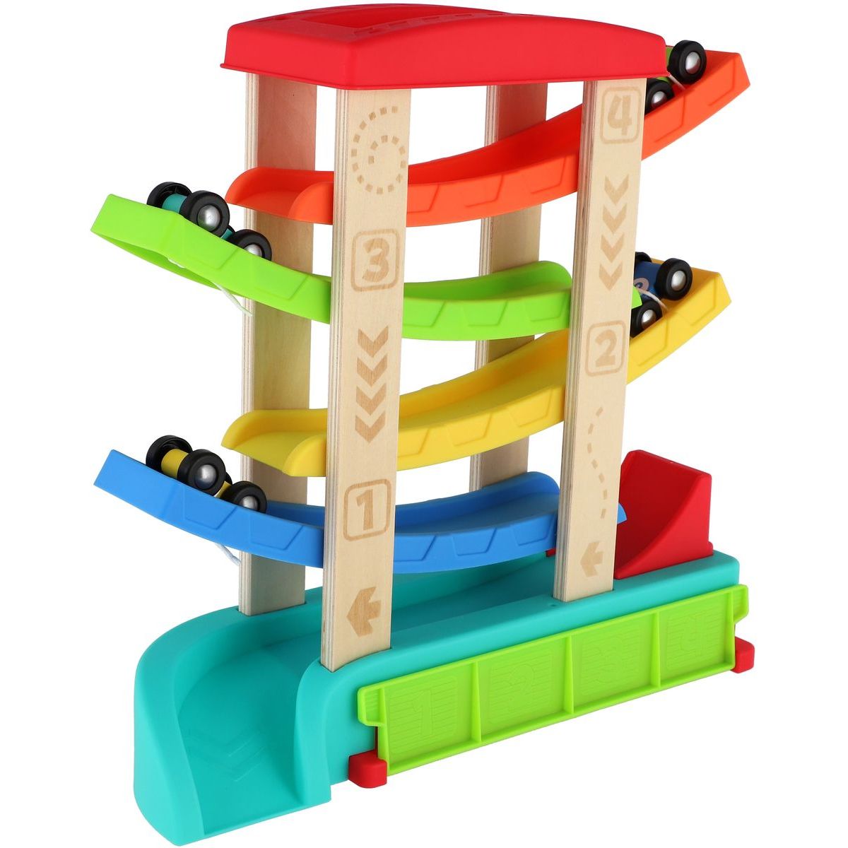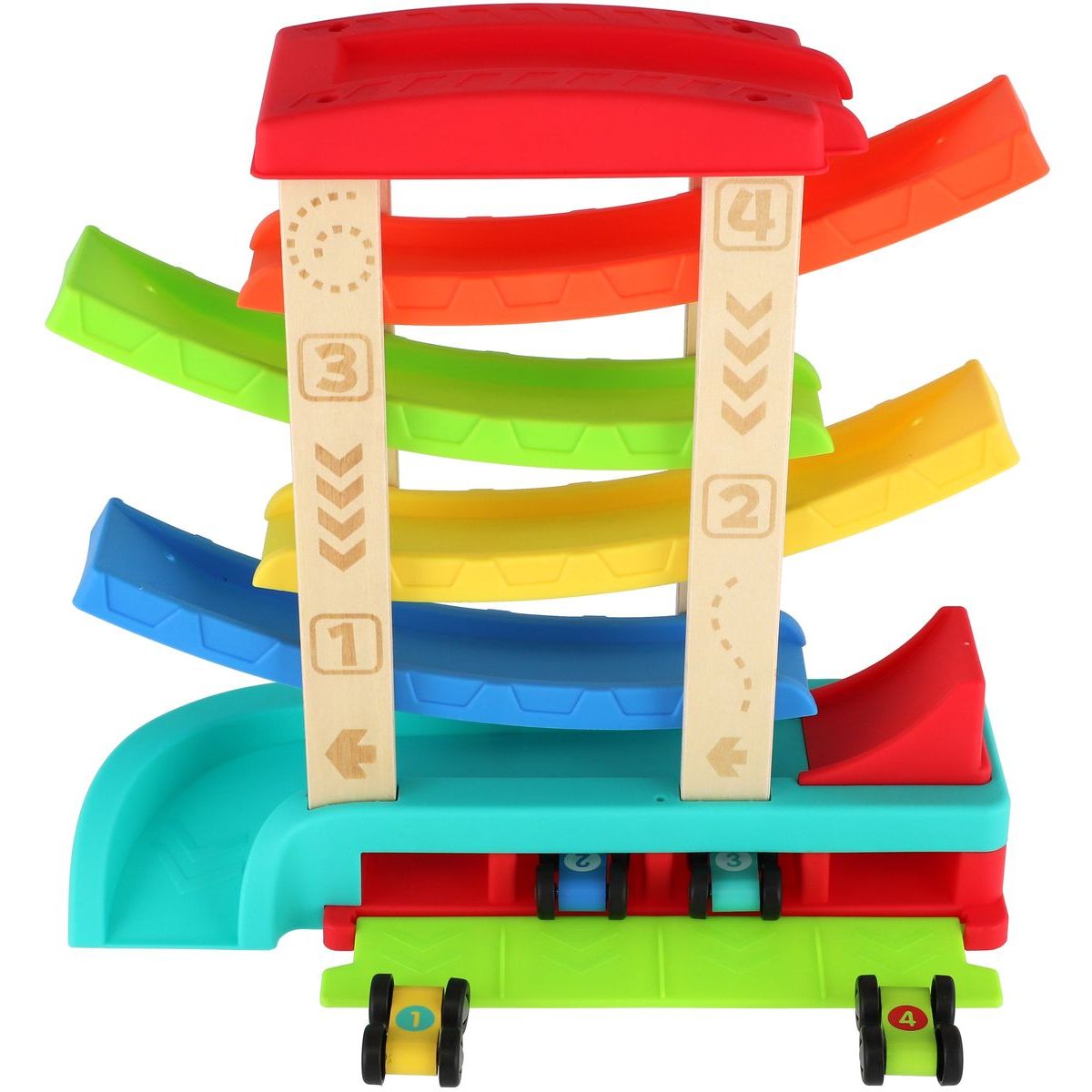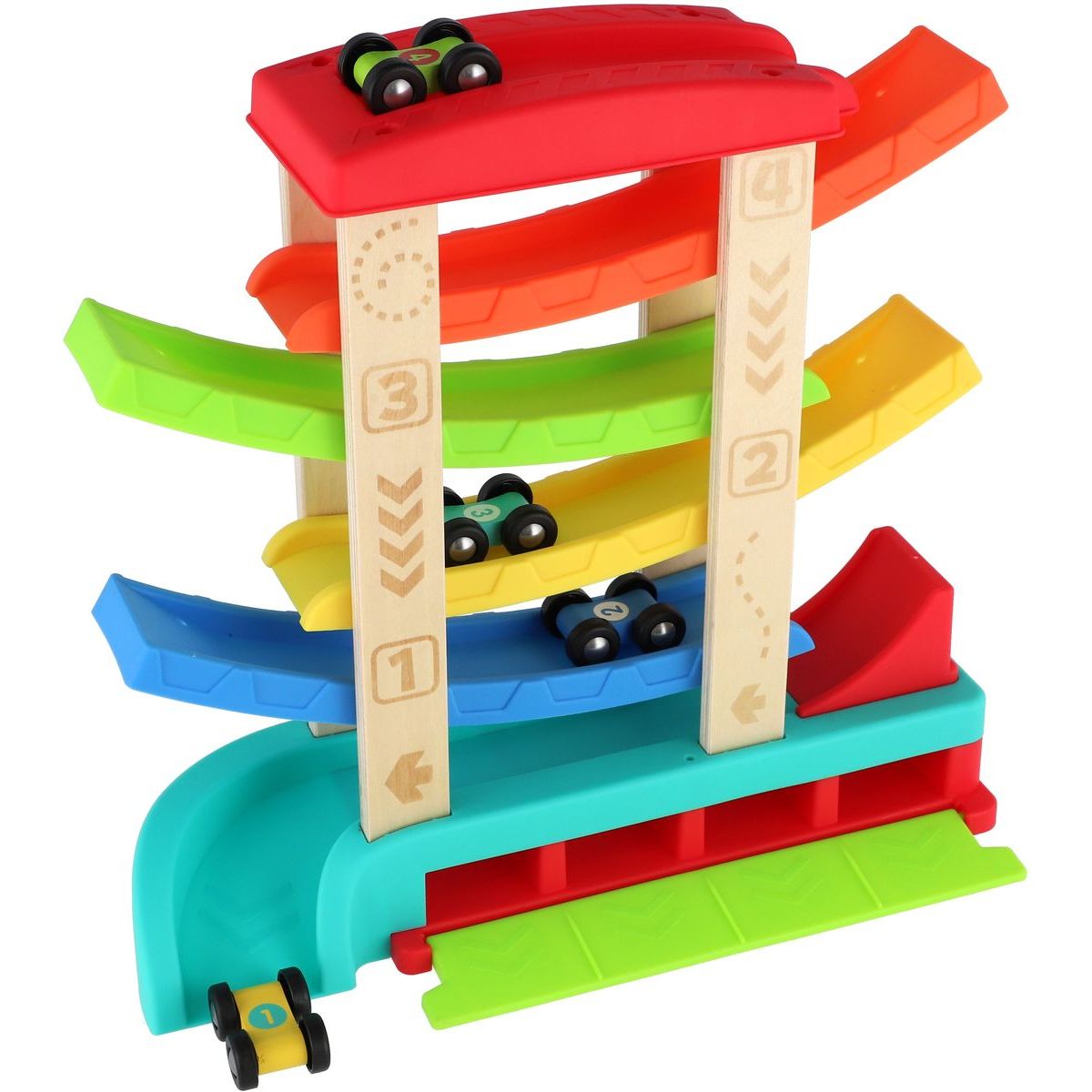 Barevná závodní kaskádová dráha Teddies z kvalitního dřeva nabízí dětem nejen nekonečnou zábavu, ale i první seznámení s principy pohybu a gravitace. Stačí položit jedno ze čtyř malých autíček na horní plošinu a sledovat, jak sviští po barevných rampách až do cílové stanice. Tato kompaktní dráha o rozměrech 33 x 32 x 10 cm je ideální pro malé ručičky a podporuje rozvoj jemné motoriky a představivosti nejmenších závodníků od 18 měsíců. Připravte se na radostné chvíle plné smíchu a vzrušení při sledování závodu!