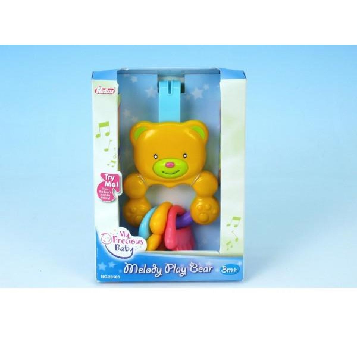 Medvídek s kousátky hraje melodii a lze ho přichytit k postýlce nebo kočárku.