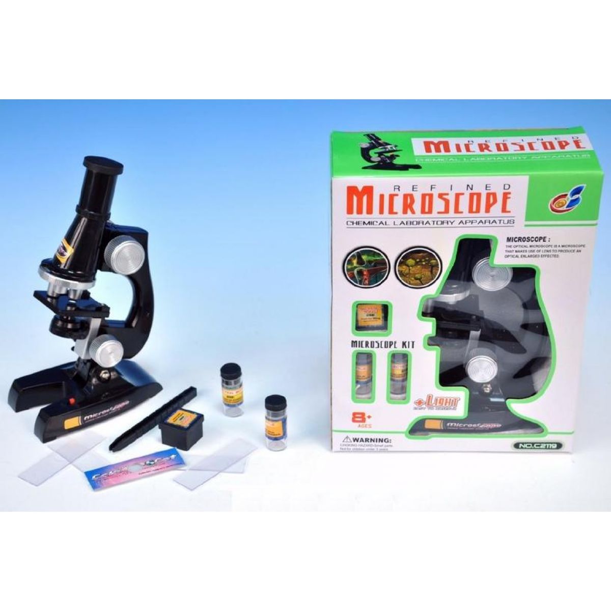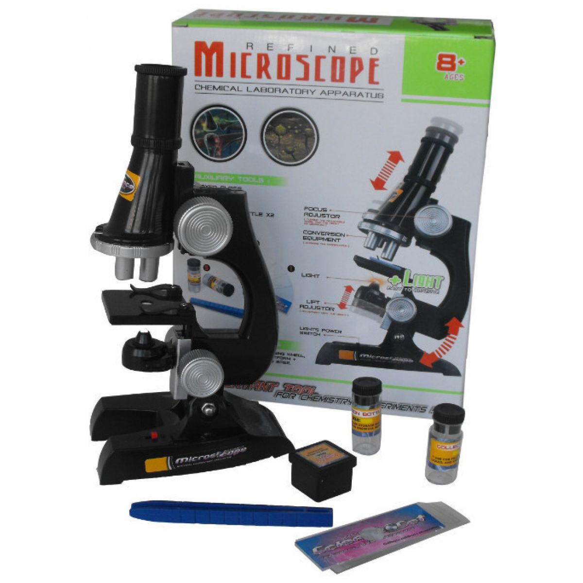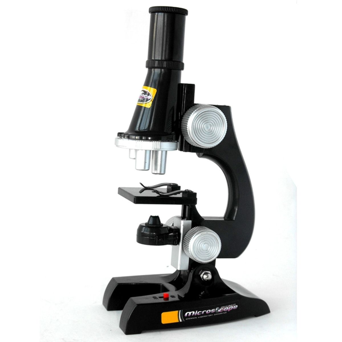 Plastový mikroskop se světlem pro lepší pozorování. Dosahuje zvětšení 100x, 200x, 450x.