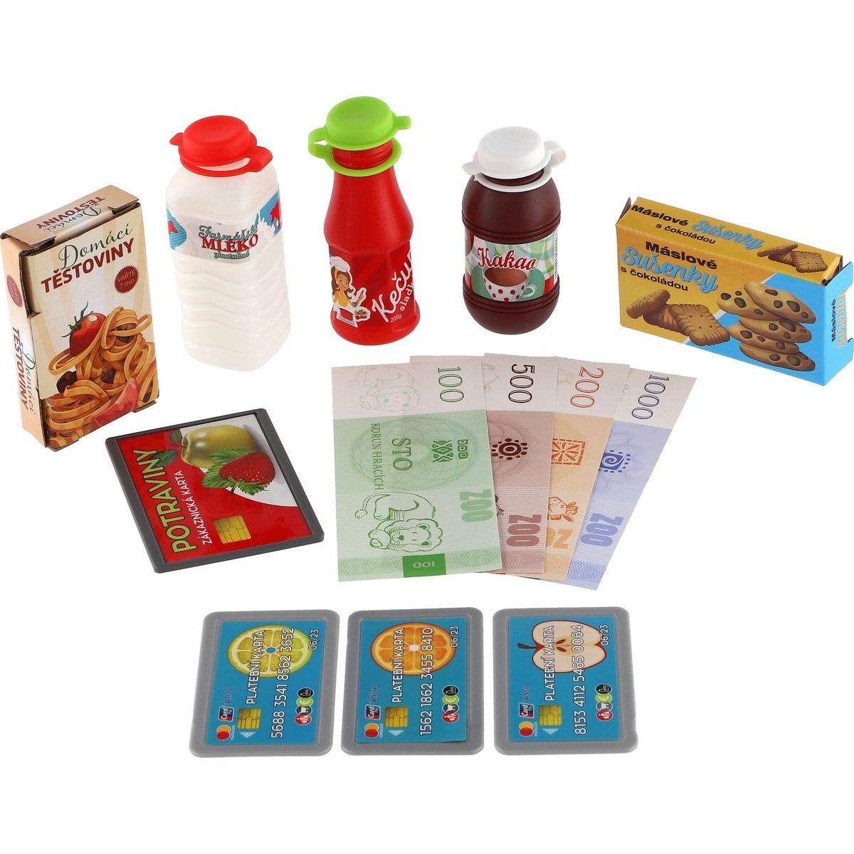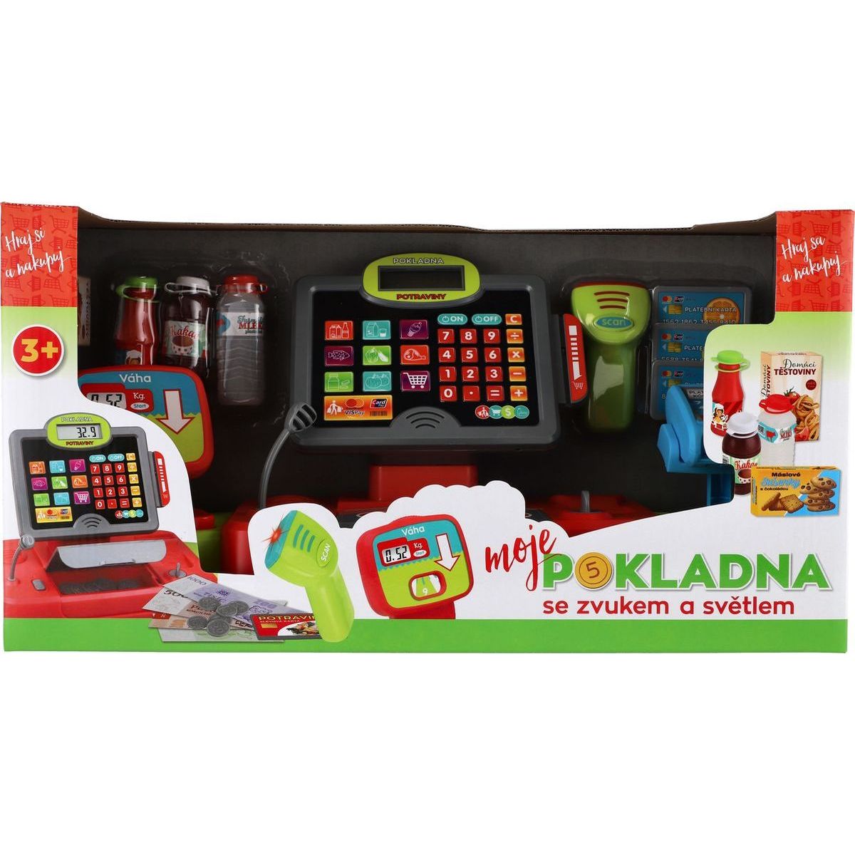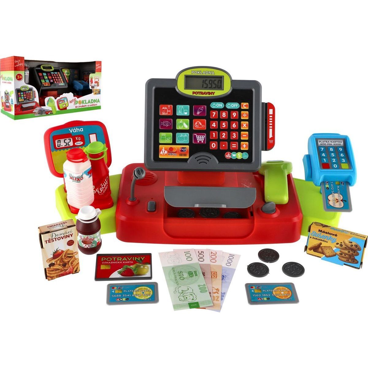 Součástí je čtečka se světlem a zvukem, makety bankovek a mincí, slot pro kreditní kartu, funkční kalkulačka, makety potravin i váha na ovoce a zeleninu.