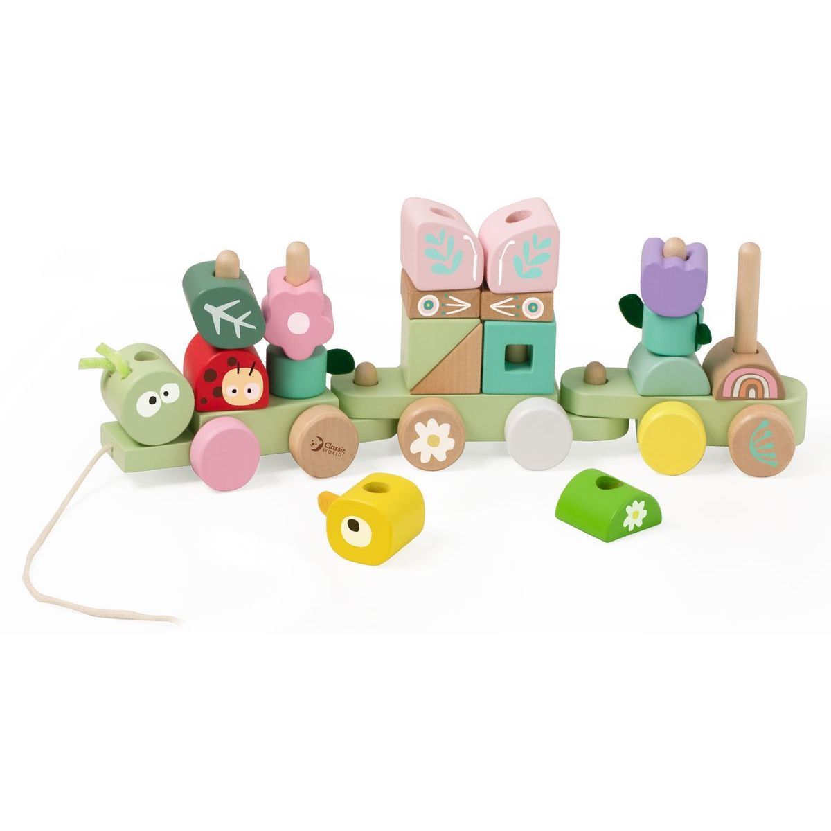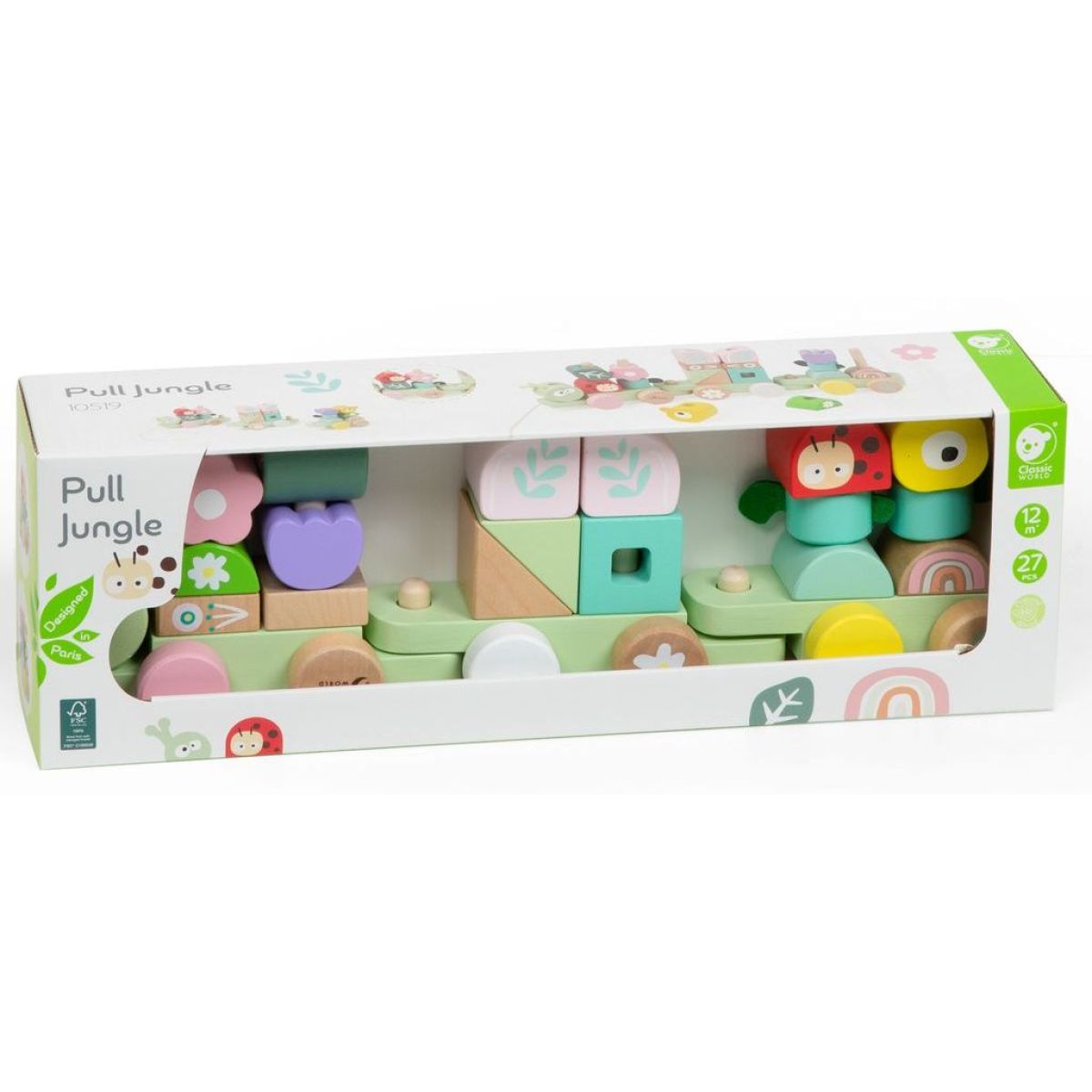 Vydejte se na dobrodružství do džungle s barevným dřevěným vláčkem, který baví nejen při hře, ale i při skládání! Tento tahací set obsahuje lokomotivu a dva vagónky, které jsou vybaveny kolíky pro navlékání 27 různých dílků. Děti tak rozvíjejí jemnou motoriku, učí se rozeznávat barvy a tvary a procvičují logické myšlení. Vláček v jemných pastelových tónech lze snadno táhnout po celém bytě díky praktickému provázku. Ideální společník pro malé objevitele od 12 měsíců, který přináší hodiny zábavy a učení v jednom.