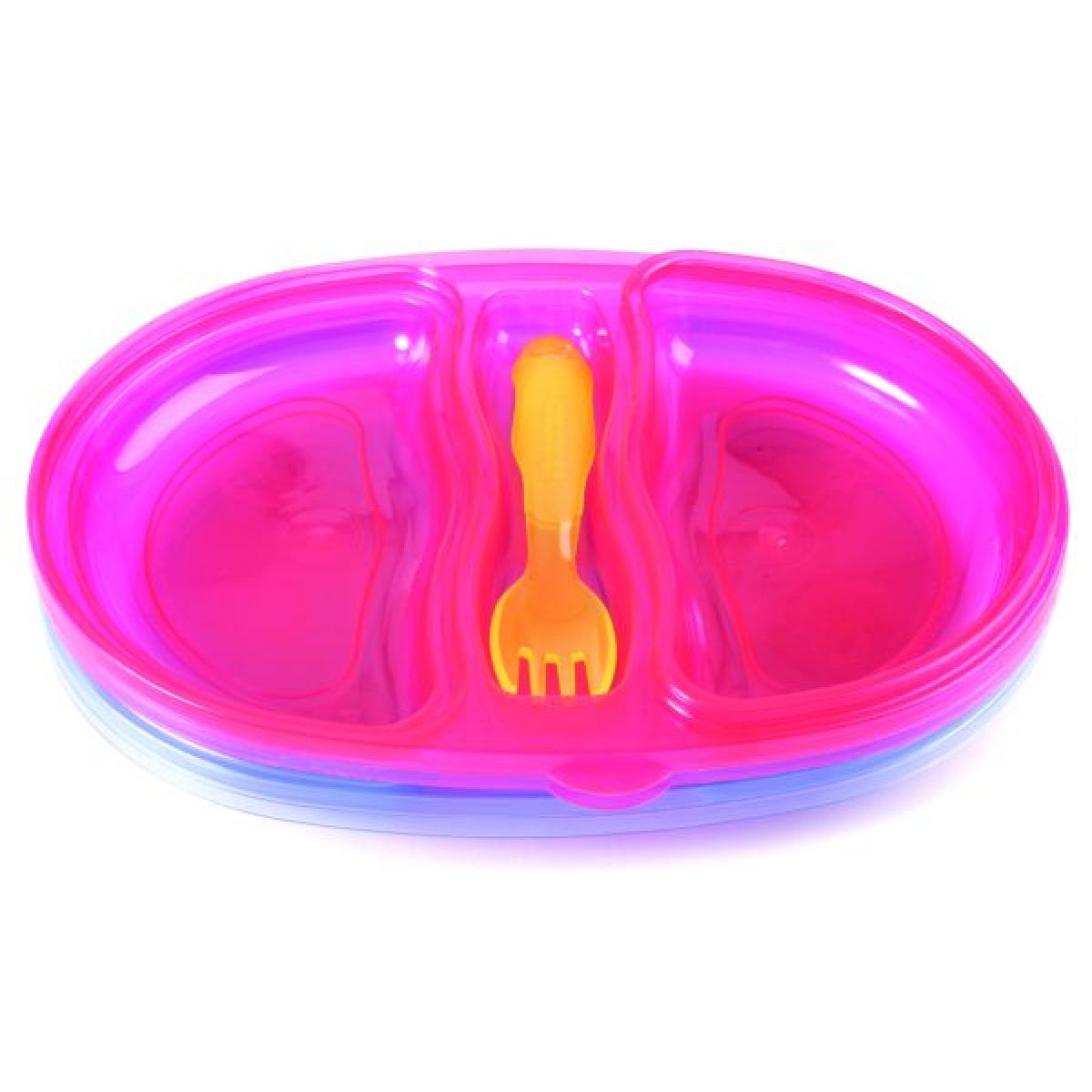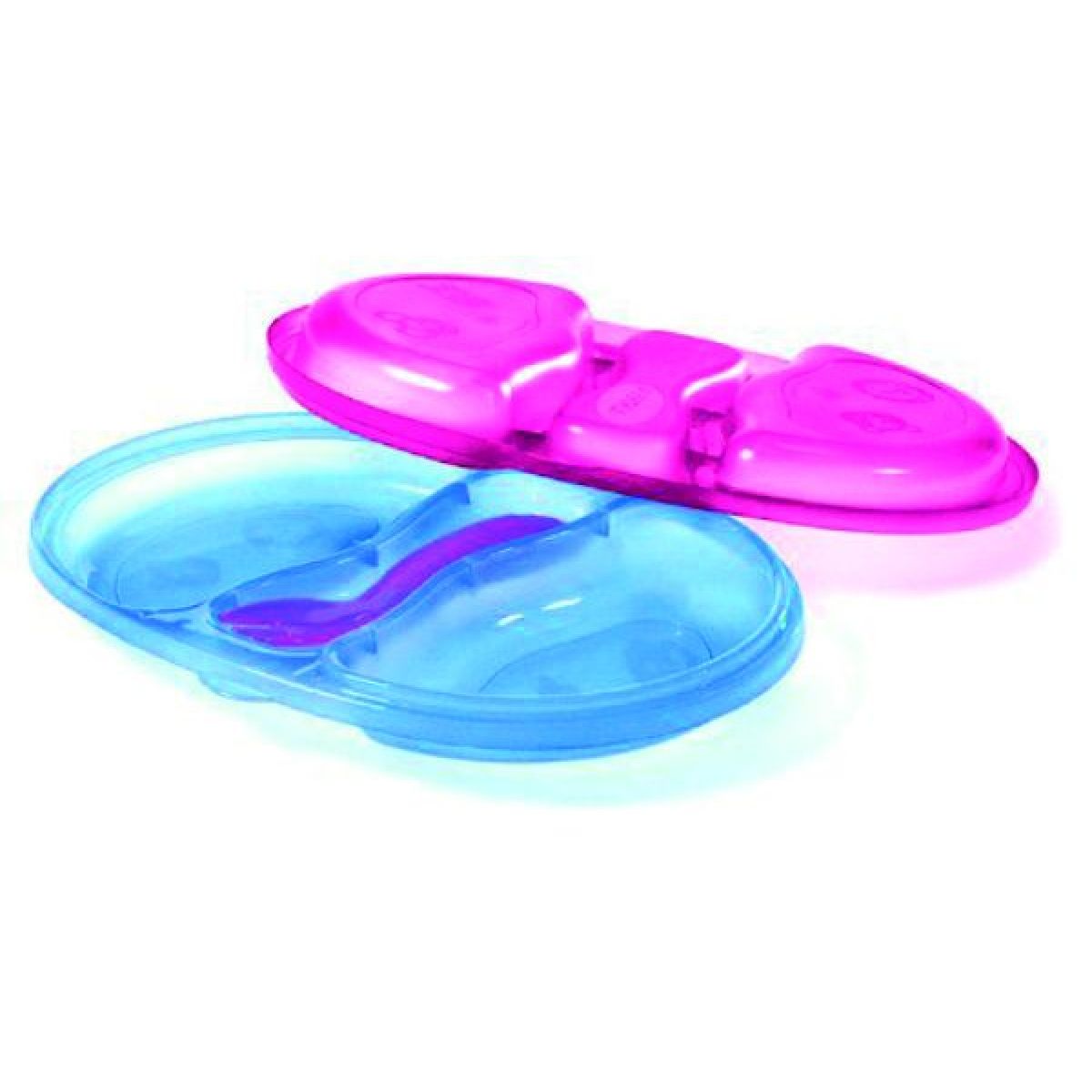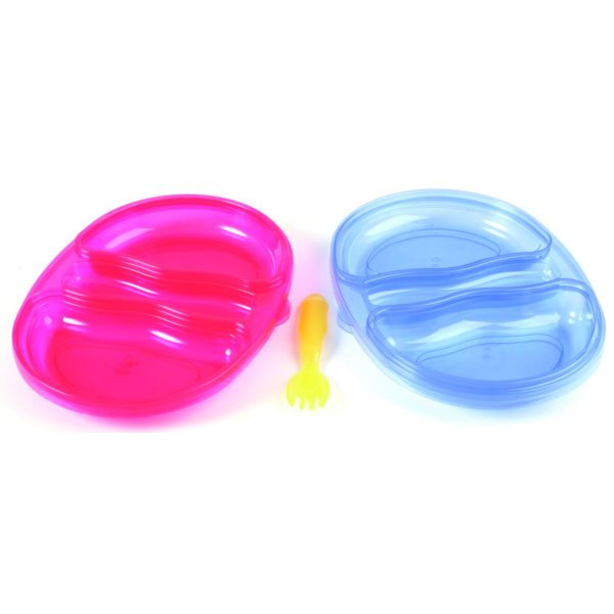 Sada obsahuje čtyři mělké dělené talíře a vidličku, druhý talíř lze použít jako víčko které dobře těsní, dělené nádoby zabraňují smíchání jídla, přihrádka na lžičku nebo vidličku, ideální na cesty, na víčku je plocha pro vyznačení jména dítěte.