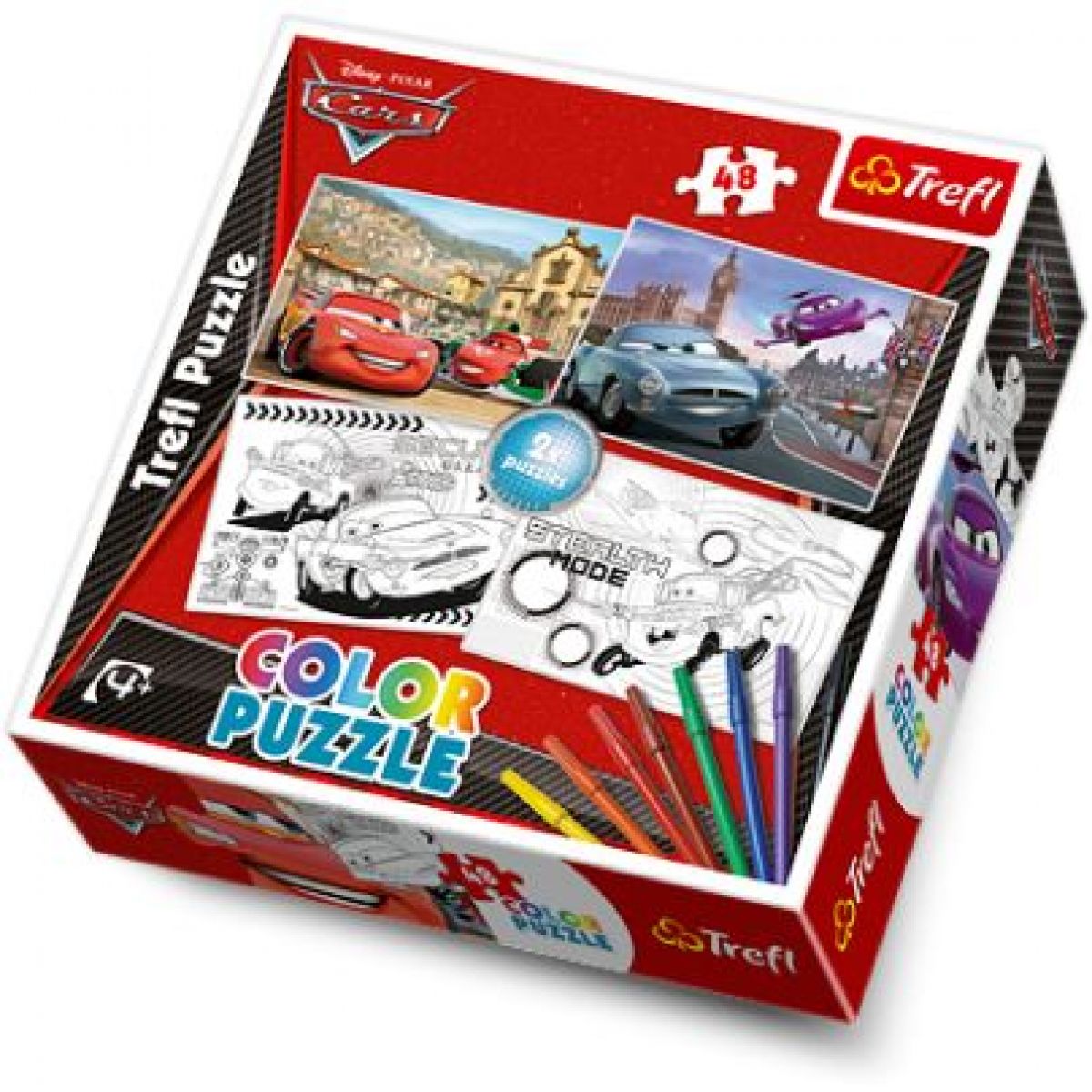 Dvě oboustranné puzzle v jednom balení. Na přední straně klasický obrázek, na zadní omalovánka k vybarvení. Fixy jsou součástí balení.
