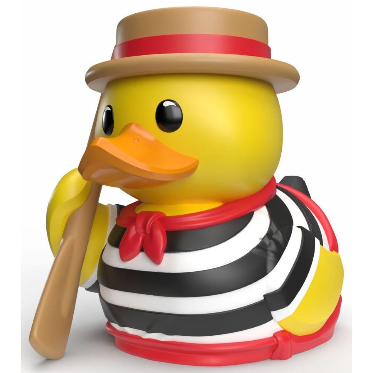 Tubbz kachnička malá – Cestovatelská edice Itálie je sběratelská figurka vysoká přibližně 5,5 cm, určená dětem od šesti let. Vyrobena je z pevného plastu a zdobí ji detailní barevné provedení inspirované tradičním italským gondoliérským oblečením. Figurku tvoří žluté tělo, oranžový zobák, světle hnědý klobouk s červenou stuhou, černobílé pruhované tričko s červeným šátkem a gondolářské pádlo. Zadní strana je lemována černou barvou symbolizující gondolu, což podtrhuje tematický design. Kachnička je dodávána v originálním balení s modrou gondolou a průhledným krytem, chránícím produkt a zároveň zajišťujícím jeho viditelnost. Produkt není určen k použití ve vodě.