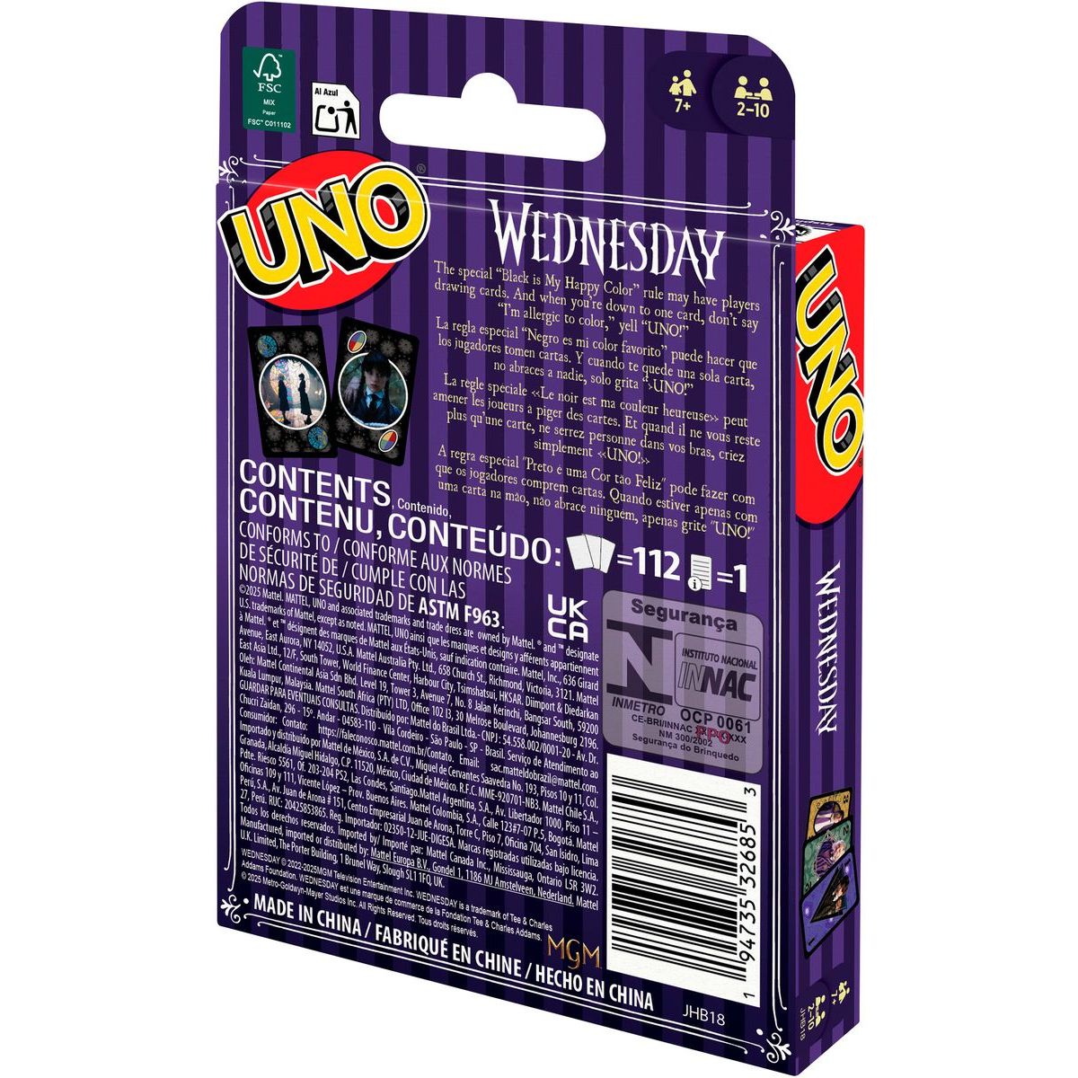 Objevte zábavu karetní hry Uno s temným nádechem seriálu Wednesday! Tato klasika, kterou znáte a milujete, nyní přichází s unikátním motivem inspirovaným tajemnou atmosférou a speciálním pravidlem, které oživí každé hraní. Dokážete být první, kdo se zbaví všech karet? Nezapomeňte při poslední kartě hlasitě zakřičet „UNO!“ a zažijte napětí i radost z vítězství. Skvělý dárek pro fanoušky seriálu i všechny, kdo rádi soutěží s rodinou či přáteli. Barvy a vzhled karet mohou být různorodé, což přidává na jedinečnosti této edice. Věk: 7+ let Šířka balení (cm): 9 Výška balení (cm): 14.5 Délka balení (cm): 2 Hmotnost balení (kg): 0.159 Země původu: Čína