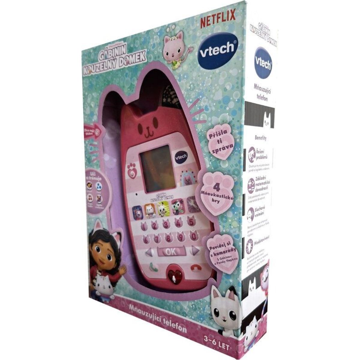 VTech Gábinin kouzelný domek – Mňauzující telefon je interaktivní vzdělávací hračka inspirovaná oblíbeným seriálem, která dětem umožňuje volat Gábině i jejím kočičím přátelům. Telefon ve tvaru kočičky věrně napodobuje ten, který používá Gábi, a díky autentickým hlasům z českého vysílání vytváří poutavý zážitek.