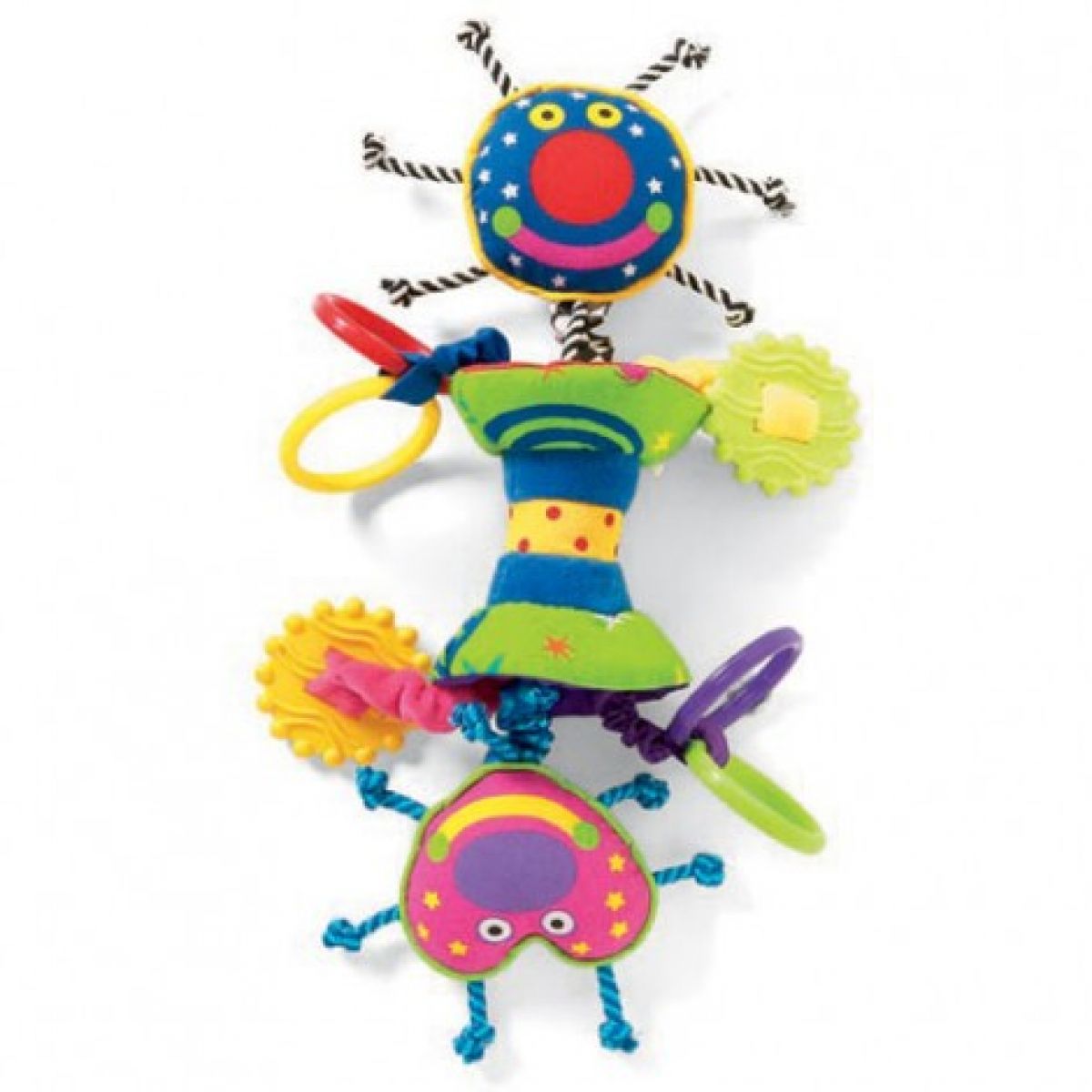 Díky měkkému, bezpečnému a pružnému šněrovadlu si mohou děti doslova osahat spoustu oblíbených materiálů i aktivit. Kuličky s rolničkami, chrastítka, hladké stužky i chladivá kousátka jsou na hračce zavěšeny pomocí jedinečných elastických natahovacích šňůrek.