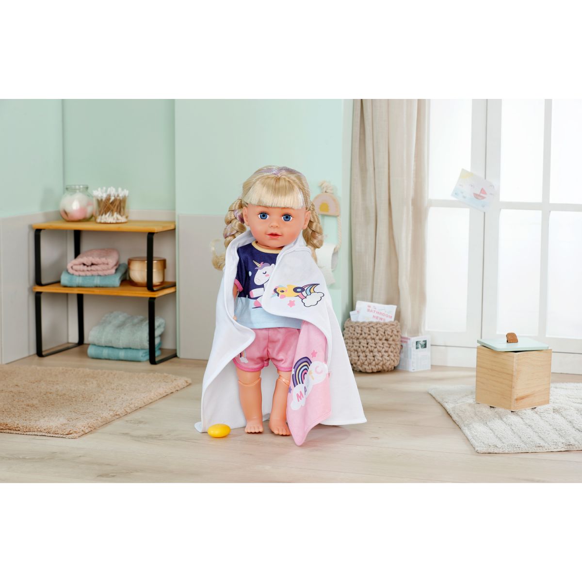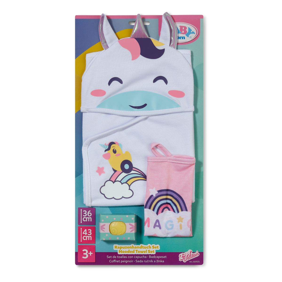 Koupání panenek může být ještě radostnější s touto exkluzivní sadou hebkých ručníků BABY born. Připravte se na pohodlné zachumlání po každé koupeli díky bílému ručníku s kapucí ozdobenou jednorožcem, roztomilými oušky a duhovým rohem. Malý růžový ručník s motivem duhy doplňuje celkový kouzelný vzhled a přináší pocit hebkosti a tepla. Materiál je pečlivě vybraný tak, aby zajistil příjemný dotek k panenkám o velikosti 36 cm i 43 cm. Nechte své děti prožít kouzelné chvíle plné fantazie a něhy při péči o jejich oblíbené panenky.