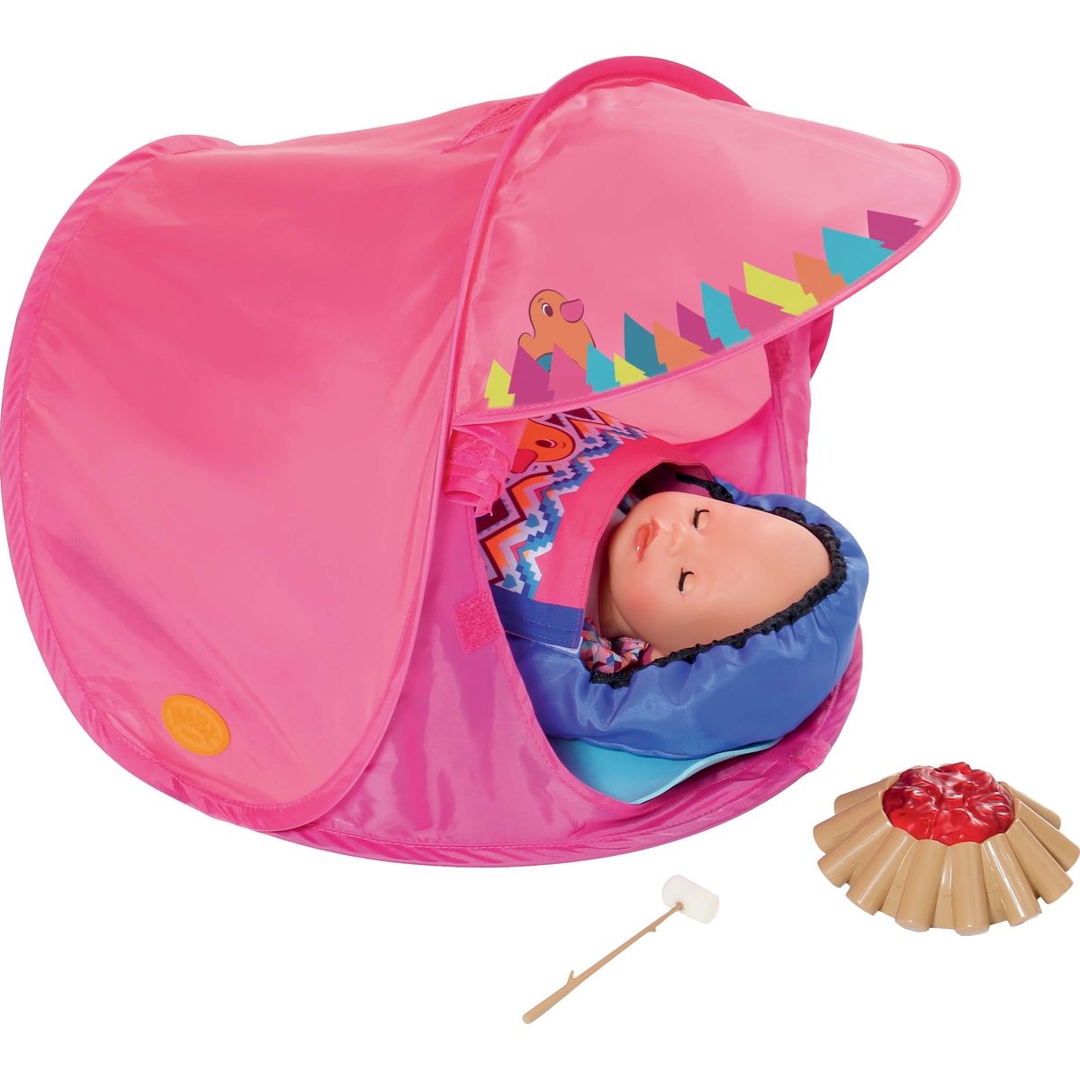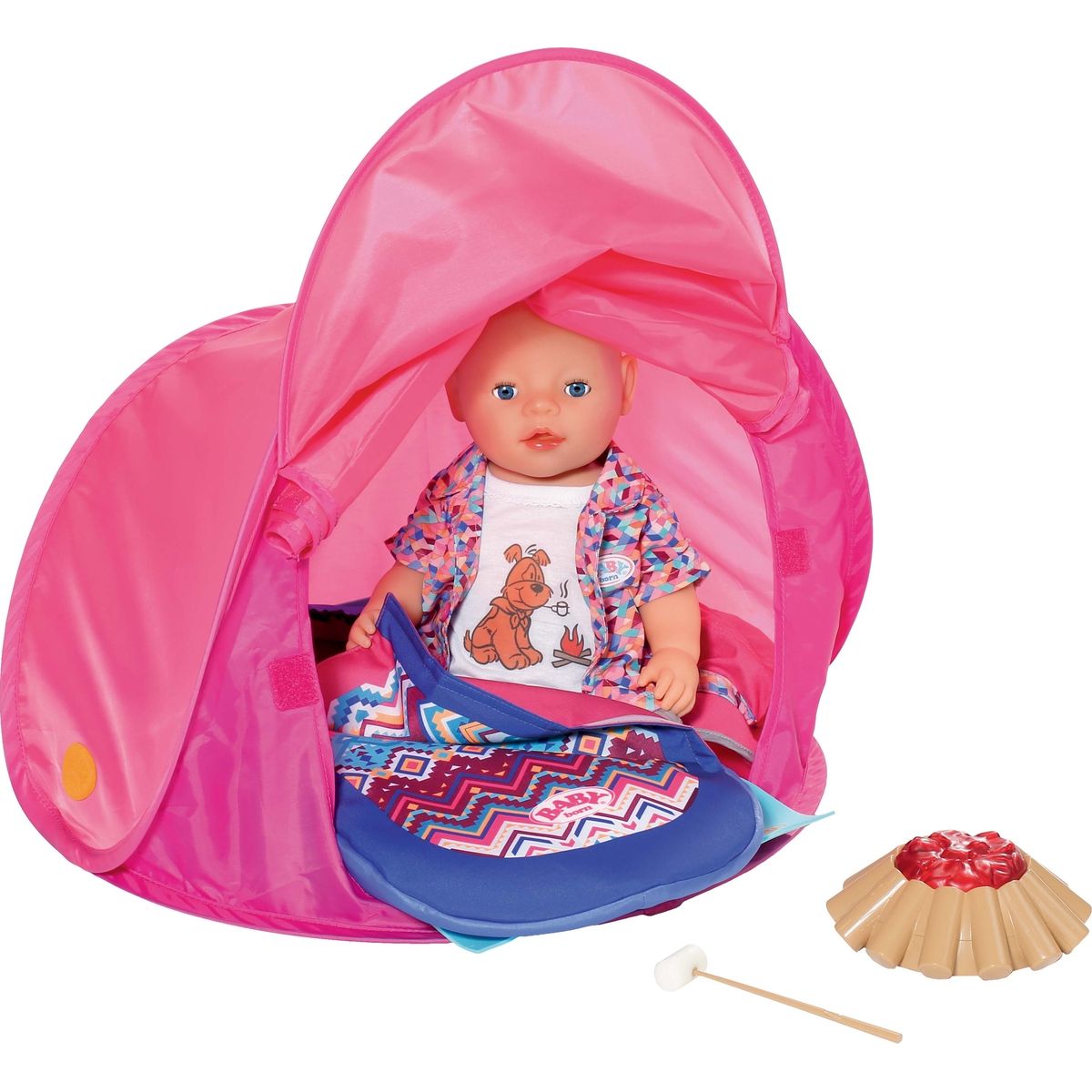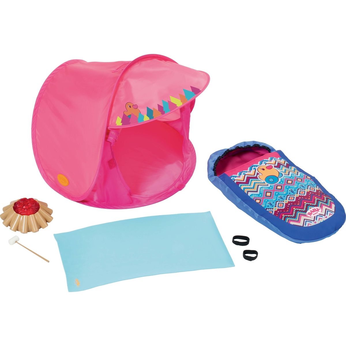BABY born® Souprava na kempování obsahuje stan, karimatku, spacák, táborák s opravdovým světlem a tyčkou na opékání marshmallow.