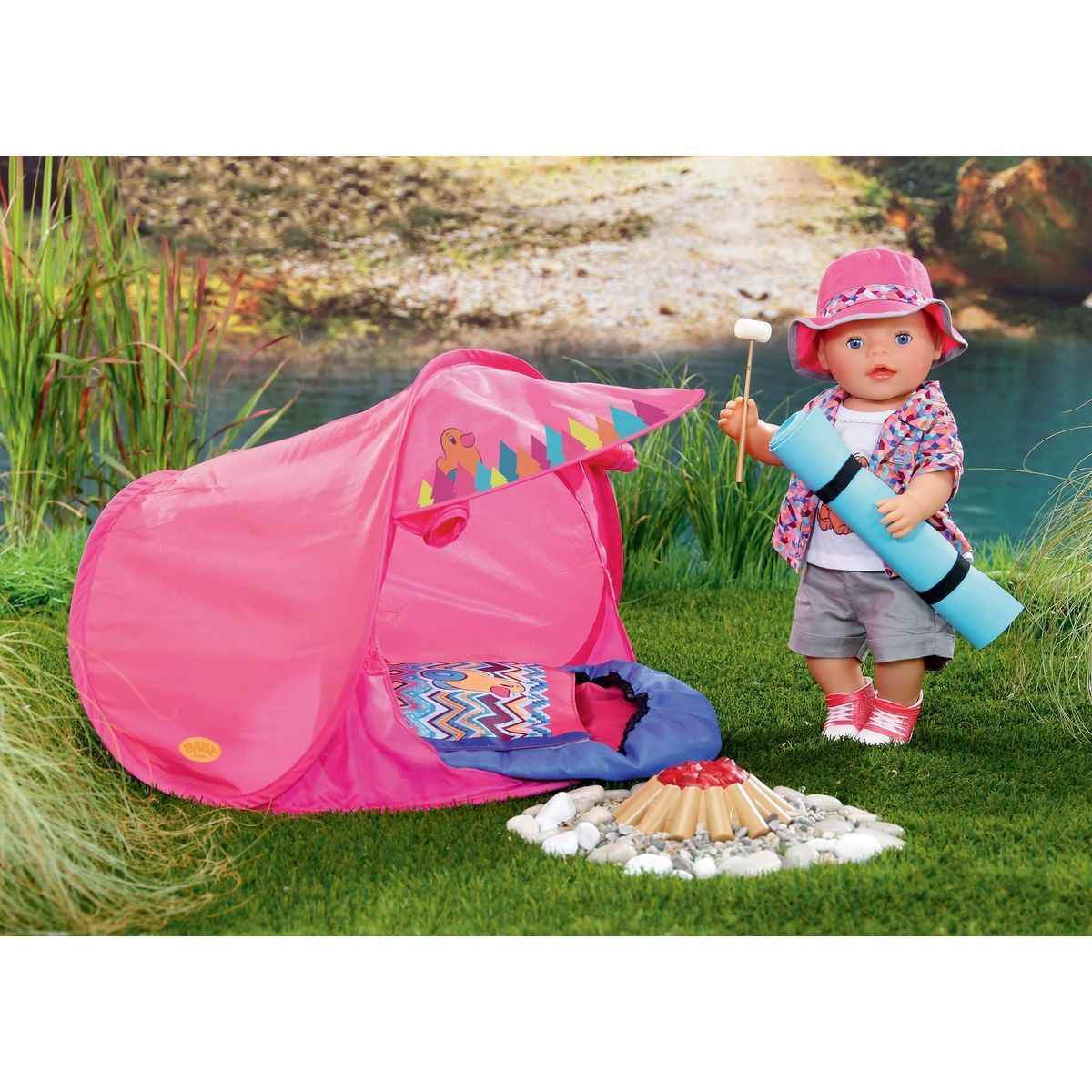 Vydej se tábořit s panenkou Baby Born. Každý výlet vždy vyžaduje důkladnou přípravu. Aby se dala strávit noc venku, je potřeba spousta věcí. BABY born® si připravila růžový stan, karimatku pro pohodlné ležení a také spacák. Stan už je postaven? Tak to už může jít BABY born® v klidu pozorovat táborák a opékat si na něm marshmallow.